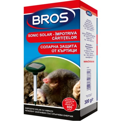 Aparat Solar Sonic BROS impotriva cartitelor, repelent alimentat cu baterii solare, acumulatorii permit continua functionare a echipamentului zi si noapte. Emite unde si vibratii sonore care resping in mod eficient daunatorii. Nu este necesara schimbarea bateriilor.