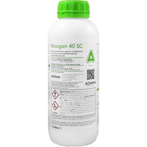 NICOGAN 40 SC este un erbicid sulfonilureic care contine Nicosulfuron, substanta activa cu puternica actiune erbicida contra buruienilor monocotiledonate greu de combatut (in special costreiul din rizomi), in conditii de selectivitate totala fata de porumb. Produsul se aplica doar postemergent si este absorbit rapid de buruieni mai ales prin frunze, dar si prin radacini si apoi se transloca atat ascendent cat si descendent in curentul de seva pana la nivelul meristemelor (punctelor de crestere), unde provoaca dereglari ireversibile in diviziunea celulara.